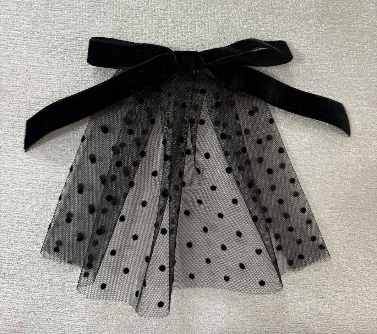 Black Velvet Bow with Black Flocked Dotted mesh Doily.